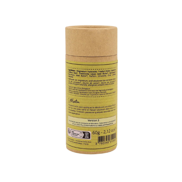Magnesium Hydroxide, Triethyl Citrate, Copernicia Cerifera Wax, Theobroma Cacao Seed Butter, Astrocaryum Murumuru Seed Butter, Parfum, Limonene, Citral, Linalool, Geraniol *issu de l'Agriculture Biologique