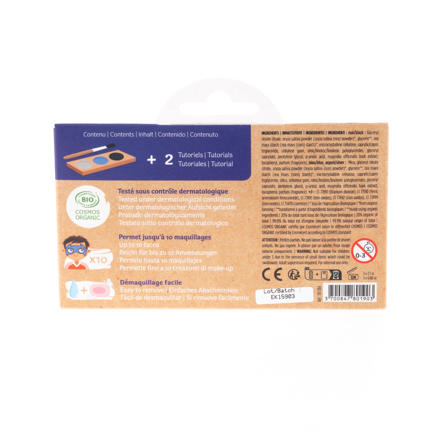 Transformez-vous en chevalier ou en super-héros avec ce kit de maquillage à l’eau certifié bio et hypoallergénique contenant une palette de 3 couleurs (argent, bleu, noir), 2 modèles de maquillage et 1 pinceau.