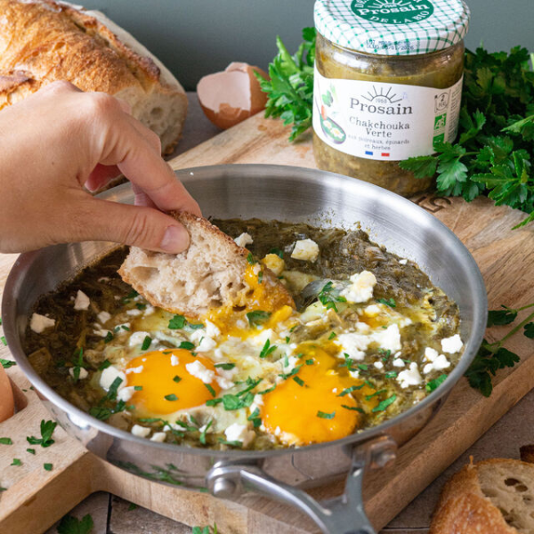 Notre Chakchouka bio a été imaginée pour être accompagnée d'œufs, de pain, de feta et d'herbes fraîches.